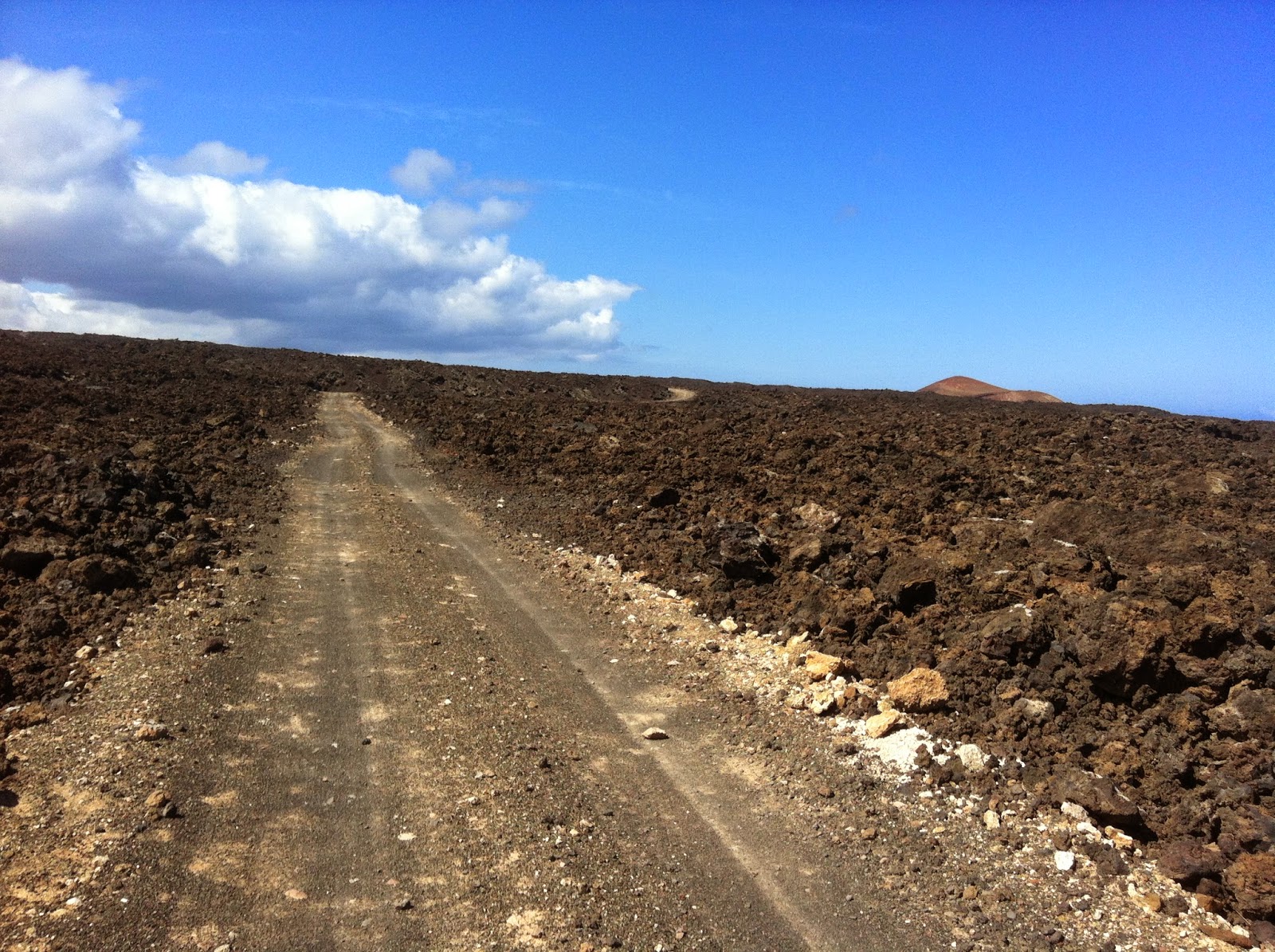 Seguramente sea el tramo más duro de todos los 300km de la ruta. El camino se abre paso entre el magma solidificado que se levanta a ambos lados. El viento no consigue aparecer para refrigerar nuestro cuerpo en este duro y caluroso ascenso hasta la carretera que une Yaiza con Mancha Blanca.